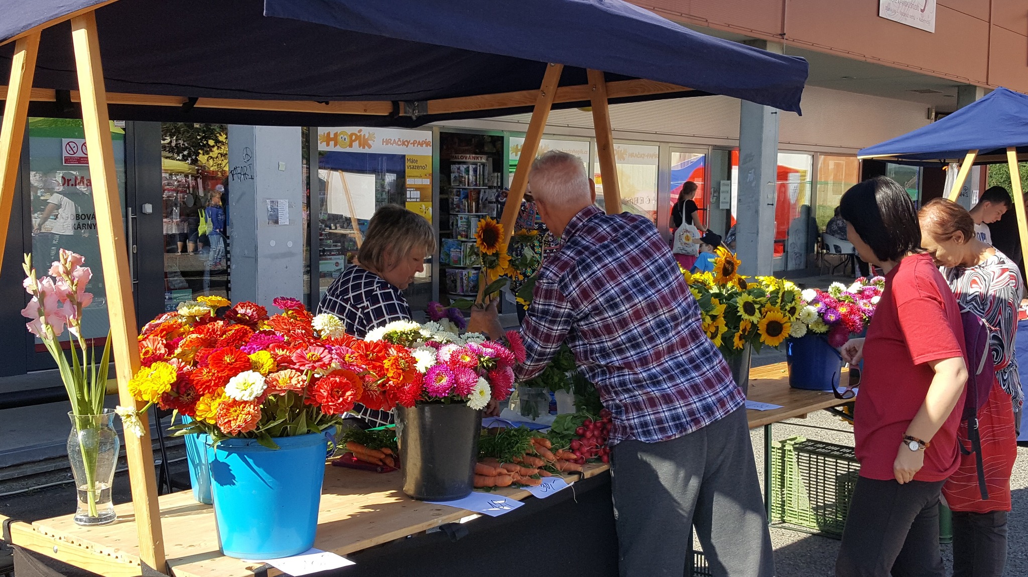 Podle slunečnic nebo dalších květin v ruce bylo poznat, kdo jde z dnešních farmářských trhů. Škoda, že tentokrát na poslední chvíli odřekl výrobce košíků s flašinetem a nepřijel bohužel ani kyjovský pivovar. Ale v říjnu by už měla být muzika i vlahý mok, takže konec babího léta bude na Halasáku povedený.